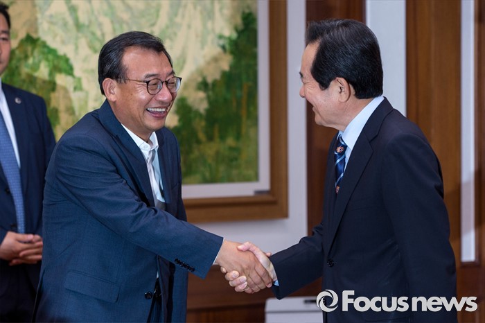 (서울=포커스뉴스) 이정현(왼쪽) 새누리당 대표가 11일 오후 서울 여의도 국회에서 정세균 국회의장을 예방해 면담에 앞서 악수 하고 있다.