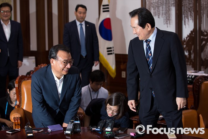 (서울=포커스뉴스) 이정현(왼쪽) 새누리당 대표가 11일 오후 서울 여의도 국회에서 정세균 국회의장을 예방해 인사를 나눈 뒤 자리에 앉고 있다.