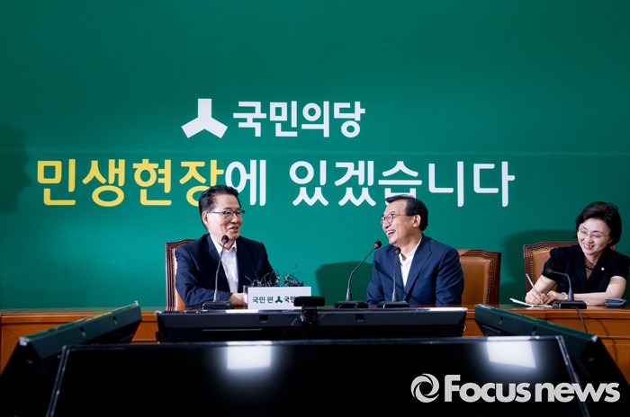 (서울=포커스뉴스) 11일 오후 서울 여의도 국회에서 박지원(왼쪽) 국민의당 비상대책위원장이 이정현(가운데) 새누리당 대표와 면담을 하고 있다.