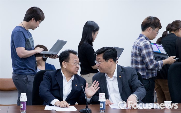 (서울=포커스뉴스) 11일 오후 서울 여의도 국회에서 열린 전기세 누진제 개편 긴급 당정 협의에 참석한 유일호(왼쪽) 경제부총리 겸 기획재정부 장관과 주형환 산업통상자원부 장관이 대화하고 있다.